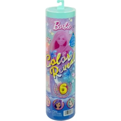 With 6 surprises in one package, Barbie Color Reveal dolls deliver waves of delight -- kids will have fun revealing this mermaid series with Original Color Reveal Innovation! Start by removing the outer layer of packaging, opening the tube and pulling out a Barbie mermaid doll -- whose look is covered in a Color Reveal shimmer sea spray coating -- and surprise bags! Open the bags to discover clothing and accessories to style Barbie doll -- a seashell hairbrush, soft tail fin and 3 charms for customization of the mermaid tail! Kids can use icy cold and warm water to transform the doll's long colorful hair for a wow moment, then repeat again and again! Barbie Color Reveal dolls make a fun gift for kids 3 years and older, who can collect them all to dive into the styling and storytelling fun!, Manufacturer: Mattel