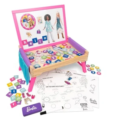 Barbie Magnetic Creation Station – A foldable wooden play board designed as a Barbie-themed creation station with a magnetic whiteboard, letters, numbers, and outfit pieces for hours of imaginative play. Dress-Up and Design Fun – Kids can mix and match Barbie outfits using magnetic clothing pieces, decorate activity sheets, or sketch their own fashion designs with the included dry-erase marker. Interactive Play Pieces – Includes magnetic numbers, letters, and Barbie-themed designs, giving children endless ways to create words, patterns, and stories in a playful way. Handy Storage & Easy Set-Up – Built-in mesh pouch keeps markers, erasers, and accessories organized. The foldable design allows for simple storage or easy transport for on-the-go play. Perfect Size for Kids – Sturdy wooden station with foldable legs measures approx. 12 x 10 x 8 inches when open and 12 x 10 x 2 inches when folded, making it just the right size for kids ages 3 and up., Manufacturer: 8th Wonder