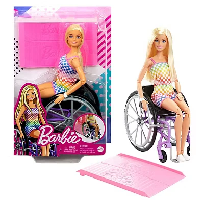 Barbie Doll with Wheelchair and Ramp, Kids Toys Gifts, Blonde, Fashionistas, Rainbow Romper, Clothes Accessories, HJT13