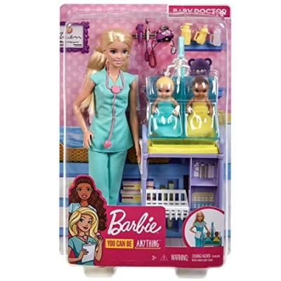 You can be a baby doctor with the Barbie Baby Doctor playset! Includes baby doctor environment with Barbie Baby Doctor doll, 2 adorable baby doll patients and toy play pieces for examinations and caretaking. Wearing light green "scrubs," and with a stethoscope around her neck, Barbie Baby Doctor doll is ready to take care of her baby doll patients. Barbie notes in her chart: the babies are doing great! Toy play items include an examination table with lotion bottle and other accessories, overhead mobile and clear compartments for the 2 baby doll patients. Explore a world of creative play and storytelling fun with the Barbie Baby Doctor Playset! Makes a great gift for kids 3 years old and up, especially those interested in medicine and caretaking! Doll cannot stand alone., Manufacturer: Mattel