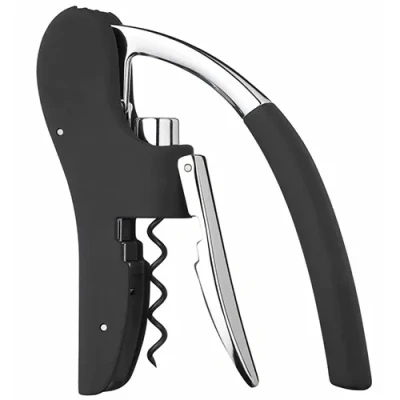 The geared action lever-arm mechanism on this deluxe corkscrew effortlessly removes corks from bottles. Finished in a stylish combination of chrome and satin touch matt black the corkscrew includes an integral foil cutter and a spare non-stick worm.12 month guarantee.