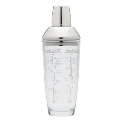 This stylish glass cocktail shaker is perfect for serving cocktails at home for friends and family when entertaining.The stainless steel cap and lid contrast well with the glass shaker base.Featuring recipes marked on the outside of the glass, including favourites like Martini and Manhattans.