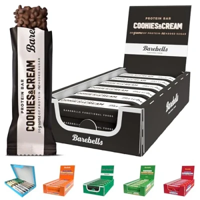 COOKIES AND CREAM - Creamy cookie-dough core embraced by sweet milk chocolate and crispy cookie crispies HIGH IN PROTEIN - Protein bars from Barebells contain 20g of protein and just a few grams of sugar per serving which makes it the perfect low calorie snack. PROTEIN SNACKS ON THE GO - Barebells is the ultimate choice for pre- and post-workout, as high protein snack at the office or for anyone who wants to satisfy their chocolate cravings. WE BELIEVE IN HAPPY EATING AND HEALTHY LIVING - the Barebells protein bar is famous for its soft texture and amazing taste. Never compromising on flavor, Barebells protein bars are here to wow your taste buds. PALM OIL-FREE AND NO ADDED SUGAR - Enjoy the reassurance that all our bars are crafted without palm oil and made without any added sugars