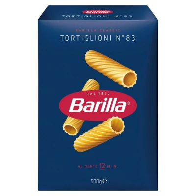 Barilla Tortiglioni 500g is a classic Italian pasta made from durum wheat semolina and water, featuring vertical ridges that hold rich sauces. Cooks in 12 minutes for perfect al dente texture, ideal with ragù, seafood, or in salads—delicious hot or cold.