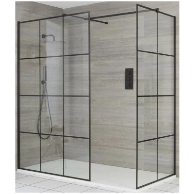Barq Black Corner Walk In Wet Room Shower Enclosure with Grid Pattern Screens Support Arms and White Slate Effect Tray 1100mm x 700mm Milano