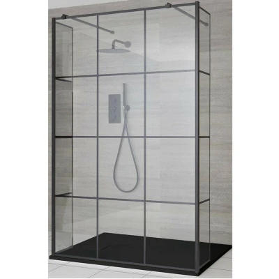 Barq Black Floating Glass Walk In Wet Room Shower Enclosure with Grid Pattern Screen Hinged Return Panels Support Arms and Graphite Slate Effect