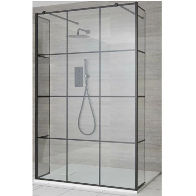 Barq Black Floating Glass Walk In Wet Room Shower Enclosure with Grid Pattern Screen Hinged Return Panels Support Arms and White Slate Effect Tray