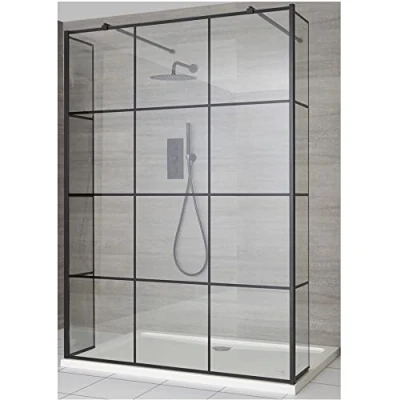 Barq Black Floating Glass Walk In Wet Room Shower Enclosure with Grid Pattern Screen Hinged Return Panels Support Arms and White Tray 900mm x