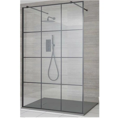 Barq Black Floating Glass Walk In Wet Room Shower Enclosure with Grid Pattern Screen Support Arms and Light Grey Slate Effect Tray 1000mm x 800mm
