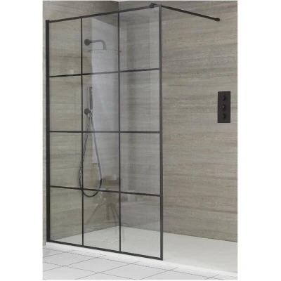 Barq Black Recessed Walk In Wet Room Shower Enclosure with Grid Pattern Screen Support Arm and White Slate Effect Tray 1200mm x 800mm Milano