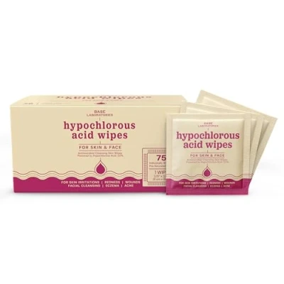 Base Labs Hypochlorous Acid Wipes Saline Solution and HOCl Infused Wound Cleaning for Skin & Face Cleanses, Sanitizes Soothes Irritations, Fresh Piercings, Acne Eczema 75