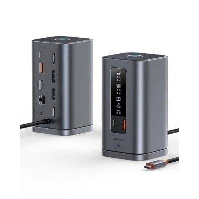 【PD 100W Fast Charging】Please note that the power adapter is not included. The maximum 100W input USB-C port of the USB-C dock provides you with a variety of expansion functions. To ensure stable performance for all ports, we recommend connecting a PD 100W charger and cable to the PD input port of the docking station. 【Recommended by Forbes】Baseus' newly designed docking station has been highly recommended by Forbes 【Multifunctional 11-in-1 Expansion】The USB docking station is equipped with 2 HDMI and 2 DisplayPort, USB-C and 2 USB-A 10Gbps data ports, USB-A 2.0 port, 100W PD port, 1Gbps Ethernet port and 3.5mm AUX jack. One dock meets diverse expansion needs. 【Innovative Design & Screen Lock Button】The unique upright design plus magnetic base expands the storage space upwards and keeps the desk more tidy. The USB-C docking station is equipped with a smart LED digital display that clearly shows the working status of each interface. The screen lock button protects confidential screen information and eliminates the need for plug-and-play operation. 【Stunning Triple Display】The docking station extends your display to up to 3 monitors in stunning 4K resolution via the HDMI and DisplayPort ports for more efficient multitasking.