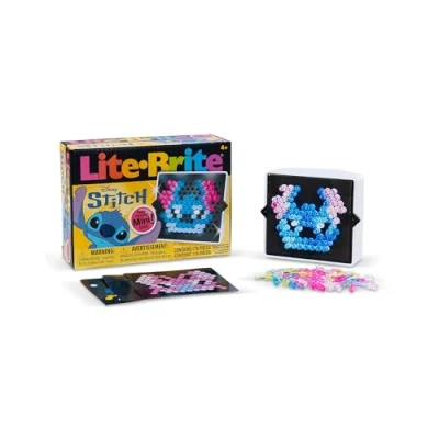 DISNEY’S STITCH IN LIGHT-UP FORM: Bring your favourite blue alien to life with the Lite-Brite Stitch Mini – a glowing celebration of Disney’s Lilo & Stitch magic. INCLUDES 4 FUN DESIGNS: Create glowing art using 4 themed templates featuring Stitch, Angel, an ice cream cone, and a flower – or design your own masterpiece! 170 MINI PEGS INCLUDED: Use 170 colourful pegs to bring your scenes to life. Great for developing fine motor skills and inspiring imaginative play. TRAVEL-SIZED FOR ON-THE-GO FUN: Compact and portable at just 3.5” wide by 3” high – perfect for car journeys, flights, or decorating your workspace. GREAT GIFT FOR STITCH FANS: A joyful activity for kids aged 6+, collectors, or Disney lovers – makes an ideal birthday gift, stocking filler, or travel companion., Manufacturer: Basic Fun