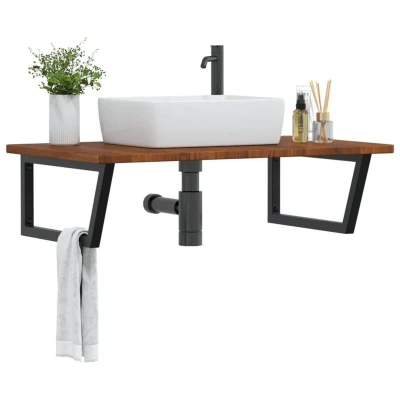 The wall mounted basin shelf securely attaches to the wall, providing an elegant and space-saving solution for your bathroom. Sturdy and long-lasting: This basin shelf is combined with a steel structure and a solid oak wood top, making it sturdy, stable, and long-lasting. Space-saving: The floating basin shelf has ample space to store creams and small items. Thanks to the trapezium shape, you can hang towels or other things on the support to save space. Easy to use: The countertop comes undrilled to allow the basin to be mounted on the left, right, or in the centre, depending on your room's requirements. Thanks to the pre-drilled holes in the holder, it can be easily assembled with the tabletop and mounted on the wall. Wide applications: Thanks to its modern design, it provides additional space for various types of bathrooms. Good to know:Screws are not included, you can purchase the screws separately based on the information provided below. Wall attachment: 2 pcs M8 expansion screws per bracket Wooden top: 2 pcs M5x18 screws (T=2) or 2 pcs M5x20 screws (T=2,5/4cm) per bracket
