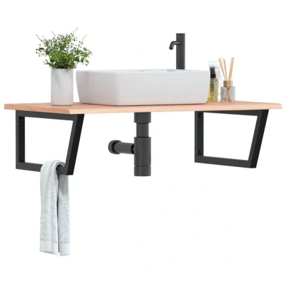 ManoManoGeneral description The wall mounted basin shelf securely attaches to the wall, providing an elegant and space-saving solution for your bathroom. This basin shelf features a sturdy steel structure combined with a solid oak wood top, ensuring stability and longevity. Its trapezium shape allows for additional storage options, making it ideal for various bathroom styles. Technical specifications Countertop: Colour: Light brown Material: Solid oak wood with a varnish finish Dimensions: 100 x 60 x 2 cm (L x W x T) Shelf bracket: Colour: Black Material: Steel Shelf bracket size: 25 x 55 cm (W x L) Tube size: 3 x 3 cm (W x L) Shape: Trapezium Loading capacity: 100 kg Wall mounting holes distance: 60 mm Tabletop hole distance to the edge: 100 mm on each side Assembly required: Yes Compatibility and accessories Screws are not included; you can purchase the screws separately based on the information provided below. Wall attachment: 2 pcs M8 expansion screws per bracket Wooden top: 2 pcs M5x18