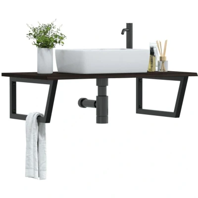 ManoManoGeneral description The wall-mounted basin shelf provides an elegant and space-saving solution for your bathroom. It features a sturdy steel structure combined with a solid oak wood top, ensuring durability and stability. The floating design offers ample space for storing creams and small items, while the trapezium shape allows for hanging towels or other items, maximizing your space. Technical specifications Countertop: Colour: Dark brown Material: Solid oak wood with a dark finish Dimensions: 100 x 60 x 2 cm (L x W x T) Shelf bracket: Colour: Black Material: Steel Shelf bracket size: 25 x 55 cm (W x L) Tube size: 3 x 3 cm (W x L) Shape: Trapezium Loading capacity: 100 kg Wall mounting holes distance: 60 mm Tabletop hole distance to the edge: 100 mm on each side With 2 holes for wall mounting and 2 holes for tabletop mounting Screws not included Assembly required: Yes Compatibility and accessories Screws are not included; you can purchase the screws separately. Wall attachment: 2 pcs