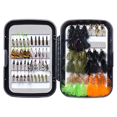 The 58 flies in 14 patterns in this collection are some of the most realistic flies to be found and include: Scud, Gnat, Bumble Bee, Mayfly, Hares Ear Nymph, Spider Fly, CDC Caddis Nymph, Beadhead Caddis Nymph, Sparkle Streamer, Bead Eyes Wet Fly, Cone Head Streamer, and Bead Head Streamer Please refer to the pictures for the detailed fly patterns and corresponding hook sizes Each fly is tied to exacting standards on chemically sharpened, high-carbon hooks This flies kit comes locked and loaded in a high grade double-sided fly box The flies included in this kit are the perfect tools for the job and are sure to get some attention, whether you’re targeting Trout, Bass, Panfish, Steelhead and other freshwater fish
