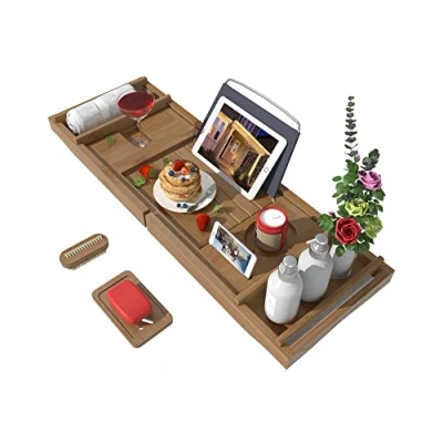 GIVE YOURSELF a BREAK: When you're taking a bath with Bamfan bathtub tray, you can relax and indulge yourself under the extremely comfortable environment ; spoil yourselves in a splendid bath, it is a necessity of your stressful life NOBLE COLOR: The bath tray frame is full of rich brown which is classic and elegant; adds luxurious appeal to your antique or modern tub MULTIFUNCTIONAL COMPONENT: With the many compartments bath caddy tray that easy reach to lean over to grab your soap, shampoo, etc. Relieve your anxiety ADJUSTABLE and FLEXIBLE: The bathtub tray caddy is adjustable that can expand 29.4 inches to 44.2 inches; fits all standard roman bathtub;you’ll definitely enjoy it AWESOME GIFT CHOICE: The bamboo bath tray is your perfect gifts choices as Valentine's Day, Monther’s Day, Thanksgiving;you family and friends would think you’re tasteful