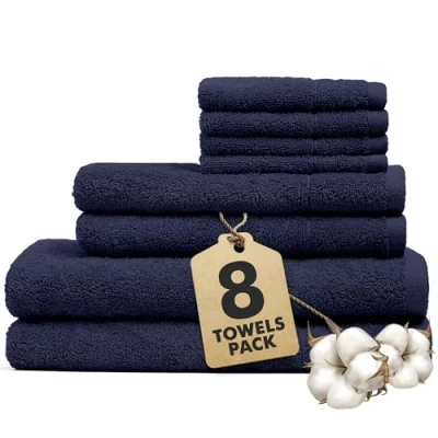 Bath Towels Set of 8 100% Cotton Navy BlueTowel Bale Includes 2 Bath, Hand, 4 Face Soft, Absorbent & Quick Dry Towel for Bathroom, Spa, Kitchen, Hotel Use