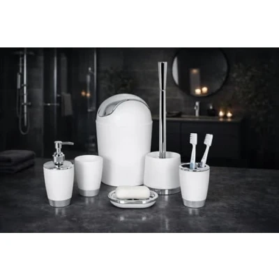 Modern Design and Eye catching bathroom set comes with Modern Design 6 Piece Bathroom Accessory Set, Toilet Brush, Waste Bin, Soap Dish, Tooth Brush Holder Soap Dispenser, Rinse Cup Perfect size and beautifully styled, is great product to decorate your Bathroom. Helps you keep your bathroom clean, tidy And in order. Super easy to assemble,done within a few minutes, also able to be disassembled,particularly Soap Bottle disassembled into rinse up Range of colors and great quality accessories for bathroom