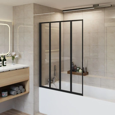 General description The Bathroom 4 Panel Folding Black Pivot Bath Shower Screen features a sleek and modern design, perfect for enhancing your bathroom's aesthetic while providing functionality. This shower screen is designed to fold neatly, allowing for easy access and space-saving convenience. Technical specifications Dimensions: W 850mm x H 1400mm Material: Matte black aluminum profile Glass: 4mm toughened safety glass Design: 4 folding panels, each enclosed with a black frame Pivot system with lifting function Rotation: 180° for ease of access Adjustment: 15mm out of true wall adjustment Other information Shower screen ONLY, bath is NOT included BS EN 12150 & CE certified