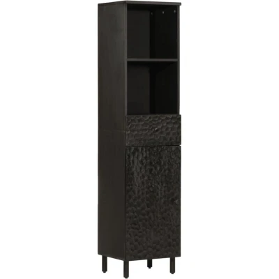 General description This bathroom cabinet is an excellent choice for keeping your bathroom tidy and organized. Made from solid mango wood, it is not only durable but also features unique wood grains that make each piece slightly different. Technical specifications Colour: Black Material: Solid mango wood with black stain, engineered wood, iron Dimensions: 38 x 33 x 160 cm (W x D x H) Assembly required: Yes Installation The flexible door can be installed on either the left or right side according to your preference. To prevent tipping, this product must be used with the provided wall attachment device. Usage This cabinet offers ample storage space to keep your essentials well organized and within reach. The sturdy iron legs enhance the cabinet's stability. Other information