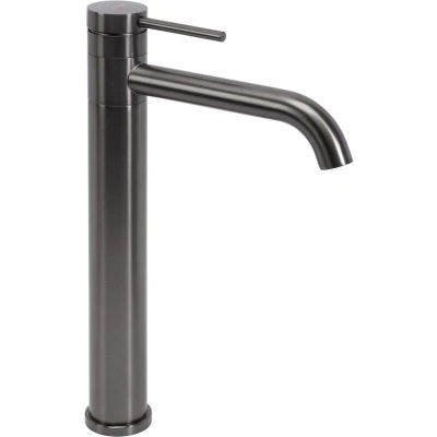General description A faucet made with functionality and appearance in mind. It is designed to perfectly fill your bathroom space while maintaining a great look and aesthetics of the interior. The faucet is intended for mounting on a washbasin or a countertop, ensuring both durability and ease of cleaning. Technical specifications Warrant: 5 years Colour: Titanium Material: Brass Faucet height: 345 mm Connection diameter: 3/8 inch Faucet type: Basin Faucet mounting method: Countertop Spout range: 165 mm Technology: PVD Head type: Ceramic - Sedal Aerator: Yes Included hose length: 50 cm - Tucai