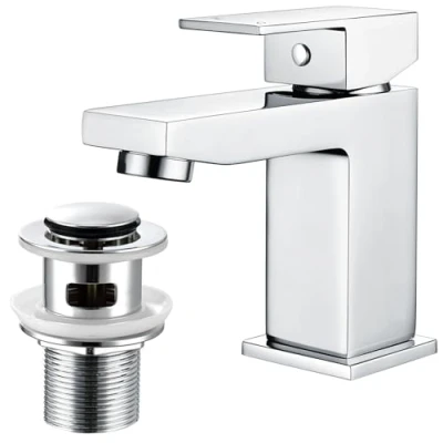 Bathroom Sink Taps Basin Mixer Tap with Pop Up Waste, Square Modern Mono Single Lever Drain for Bathroom, Washroom, Cloakroom, Chrome