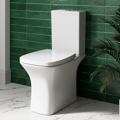 General description This rimless close coupled bathroom toilet combines modern design with functionality, making it an ideal choice for small spaces such as en-suites or cloakrooms. The toilet features a short projection pan that provides extra legroom, ensuring comfort in compact bathrooms. Technical specifications Style: Modern Toilet Type: Close Coupled Pan Type: Standard Pan Shape: Square Pan Width: 365mm Pan Height: 420mm Pan Projection: Short Projection Total Projection: 635mm Flush Type: Push Button Rim Type: Rimless Toilet dimensions: 365mm (W) x 830mm (H) x 635mm (D) Compatibility and accessories Includes Rimless Pan Dual Flush Cistern with Dual Flush Button Soft Close Seat Installation Top fix hinges for easy seat installation Usage Dual flush cistern helps save water and reduce costs Ideal for busy family bathrooms Other information 25 Year Guarantee