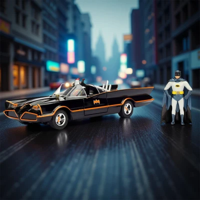 Unleash childhood dreams with the Batman 1966 Classic Batmobile, a whimsical 1:24 scale replica that brings back the essence of retro Gotham. This delightful collectable isn't just a car; it's a portal to thrilling adventures, featuring functional doors and smooth-rolling wheels that promise endless excitement for all ages. Included is a charming 2.75-inch Batman figure, igniting your imagination and making it the perfect companion for any heroic escapade. Whether it's a day of play or showcasing on your shelf, this little gem ensures you'll be the talk of the town for Batman memorabilia. It's a striking piece that makes nostalgia chic again, ideal for fans and collectors alike. So buckle up and get ready to zoom into a vibrant world of classic TV nostalgia, where every ride tells a story!