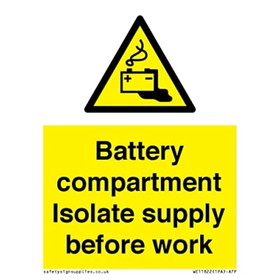 Battery compartment Isolate supply before work Sign 75x100mm A7P