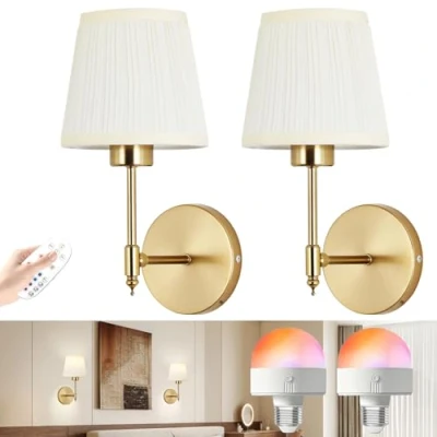 【Wireless or Wired Installation 】It offers both wireless mounting and wired connection options, allowing you to freely place lighting in any corner. Whether for homes, rentals, or dimly lit areas, it provides appropriate lighting. The built-in battery ensures constant illumination even during power outages. 【Rechargeable Bulbs】Equipped with a built-in 4000mAh high-capacity battery, this bulb supports extended usage and reliable performance. It features a magnetic base for easy detachment and recharging via the included USB port. Each full charge provides 15 to 50 hours of illumination, helping you save on electricity costs while reducing the need for frequent replacements. 【Dimmable and Color Customization】: Adjustable color temperature (3000K to 6500K),10 brightness levels (10%-100%) and 12 RGB color options to suit any ambiance requirement. 【Remote Control & Timer Function】:The light fixtures Operate lighting via remote control.Conveniently adjust on/off, brightness,color,and more from anywhere in the room.Easily set the wall lamp's automatic timer shut-off to extend battery life and reduce unnecessary power consumption.Even better,the battery-powered wall lamp remembers your last color and brightness settings after power outages and restarts,eliminating reconfiguration hassles. 【Premium Materials】:Crafted from high-hardness metal,this LED multifunctional wall lamp features a gold-plated finish for lasting durability.The fabric shade filters light to protect your eyes.Its compact,sturdy design makes it ideal for bedroom decor,living rooms,hallways,closets and display cabinets.It also serves as a reliable light source for work, study,outdoor camping and emergencies.