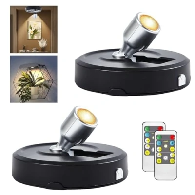 Battery Powered Picture Lights, 2Pack LED Spotlight, Uplighting Indoor Puck Lights with Remote, Stick Spotlights for Wall Display Painting Artwork Accent Dartboard