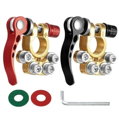 【Premium Material Car Battery Clamps】Our car battery connectors are made from high quality plated copper, sturdy and durable. The thick design is suitable for most cables with large calibres and ensures solid performance in a variety of conditions. 【Efficient Conductivity】Different from other battery connectors, our battery terminal connectors have excellent conductivity, which reduces voltage distortion and transmission loss. 【Easy to Use】Easy to assemble and disassemble without any tools. Equipped with an aluminium alloy handle for comfort and safe insulation. Note : When installing, install the positive terminal first. When disassembling, the opposite is true, the negative terminal should be disassembled first. 【4 Way Battery Terminal】The battery terminal has 4 posts for wire connections which is designed for multiple wire connections. The car battery terminals are clearly marked with positive and negative terminals for easy identification - SAE/JIS Type A terminals for cylindrical car batteries. 【Multi-purpose Battery Connectors】12-volt battery terminals can also be used in cars, boats, mobile homes, lorries, caravans and vans. Battery lead connectors can be used for 12V/24V/60V car batteries. Good corrosion and rust resistance for long term use. 【Package Includes】You will receive 2 battery terminals, 2 insulation pads, 4 terminals, 4 insulation (red + black), which can provide great convenience for your installation.
