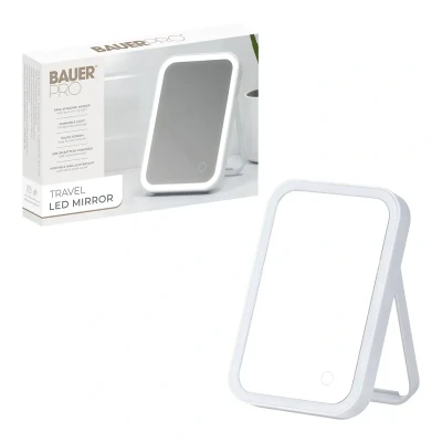 The Bauer Portable LED Mirror With Stand (White, 62279) is a compact, USB-rechargeable vanity mirror featuring touch control, adjustable LED ring lighting, and a freestanding design—ideal for precise makeup, grooming, and travel. Lightweight with a modern finish, it offers cordless convenience and even illumination anywhere.