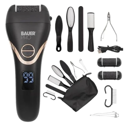 ELECTRIC FOOT FILE HARD SKIN REMOVER - With this electric foot file plus accessories, you can achieve a salon-quality pedicure at home. The file effortlessly removes rough, dry skin with three interchangeable roller heads tailored for different exfoliation levels — coarse for hard calluses, regular for newly formed dead skin, and fine for daily foot care. Stay polished and confident wherever you go. RECHARGEABLE AND LONG LASTING - Enjoy up to 180 minutes of continuous use on a full 3-hour charge. The USB-rechargeable design lets you power up anywhere, while the LED digital display informs you of the remaining battery life. LED LIGHT AND ADJUSTABLE SPEED -The built-in LED light helps you accurately target and treat rough areas, ensuring you don't miss a spot. With two adjustable speed settings, you can customise your exfoliation to suit your skin's needs. WATER RESISTANT AND TRAVEL READY -The IPX4 waterproof rating allows for safe use in wet conditions, so you can use it in the bathroom worry-free. The included storage bag and 7-piece pedicure accessory set make it easy to maintain silky smooth feet on the go, perfect for at-home pampering or travel. BAUER PROFESSIONAL - Bauer Professional is the leading manufacturer of salon quality hair products, as well as beauty and personal care products for both men and women. Browse the whole range at the Bauer Professional page on Amazon today.