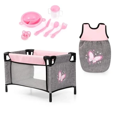 Doll accessory set with travel bed, sleeping bag, shoulder bag and accessories Doll bed suitable for dolls up to 16,5 inch / 42 cm Sleeping bag for dolls perfect to keep the baby doll warm Feeding set with cutlery, plate, drinking mug and dummy to care for the doll Perfect playset for many different role plays with the doll, Manufacturer: Bayer Design
