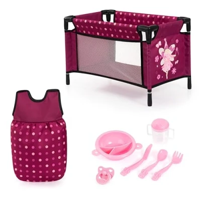 Doll accessory set with travel bed, sleeping bag, shoulder bag and accessories Doll bed suitable for dolls up to 16,5 inch / 42 cm Sleeping bag for dolls perfect to keep the baby doll warm Feeding set with cutlery, plate, drinking mug and dummy to care for the doll Perfect playset for many different role plays with the doll, Manufacturer: Bayer Design