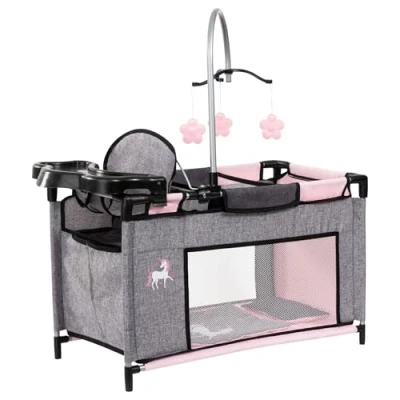 Bayer Design 62633AB Doll bed with integrated high chair, changing table, mobile, jeans grey, pink