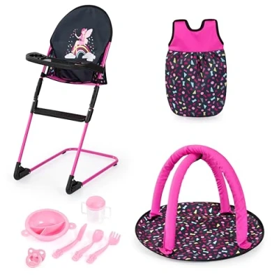 Bayer Design 63280AC doll’s high chair, play arch, sleeping bag and doll accessories for children’s role play, set ages 3+