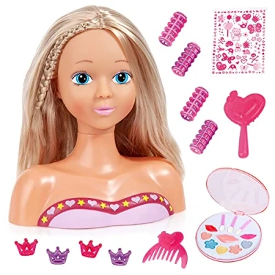 Hairdressing head approx. 27 cm with beautiful long blond hair Including lots of hair accessories like hair clips, curlers, brush, comb With colourful make-up to create a glamour look With stickers for even more fun Hairdressing head to try new styes and to be creative, Manufacturer: Bayer Design