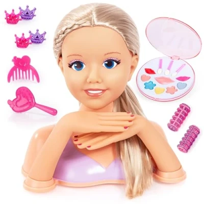 Hairdressing head (ca. 25 cm) with hands and accessories Beautiful hair for hairdos and decorations Movable head and hands which can be placed in direction of the child With accessories: comb, brush, clips and curlers Perfect for creative play and practises dexterity, Manufacturer: Bayer Design