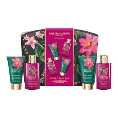 Luxury 100ml shampoo, 100ml bath & shower crème, 50ml hand & body lotion and 50ml conditioner Reusable stylish washbag, perfect for at home or on the go Baylis & Harding's Tropical Paradise floral fragrance which is delicate yet indulgent Suitable for Vegans Recyclable cardboard wrap band