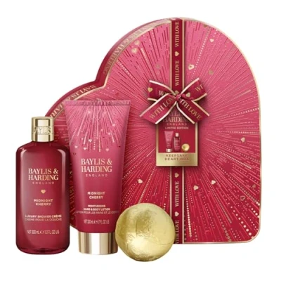 HEART-SHAPED GIFT: Treat a loved one with this luxury Baylis & Harding Midnight Cherry gift set in a heart-shaped keepsake box SURPRISE: Vegan-friendly set includes refreshing products scented like midnight cherries, the perfect surprise for someone special PACKAGING: Presented in an elegant heart keepsake gift box, ideal for gifting on any occasion QUALITY: Indulge in the luxurious scent of midnight cherry as you pamper yourself with these premium beauty products GIFT SET: Pamper your senses and uplift your mood with this elegant and thoughtful pack