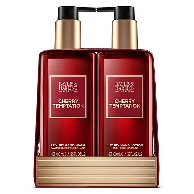 SEDUCTIVE GIFT: Treat yourself or a loved one to this duo set of Cherry Temptation Hand Wash and Lotion, delicately perfumed for luxurious care FEATURES: The Baylis & Harding Edit offers a 2 bottle set with vegan-friendly formulas that are sure to captivate your senses WHAT'S INCLUDED: A 400 ml Hand Wash and a 400 ml Hand Lotion, the perfect combination of indulgence and soothing nourishment for your hands VEGAN-FRIENDLY: Embrace ethical beauty with this cruelty-free hand care set that provides luxury without compromising on values BAYLIS & HARDING QUALITY: Known for their high-end products, this Cherry Temptation gift is ideal as a pampering treat or thoughtful present