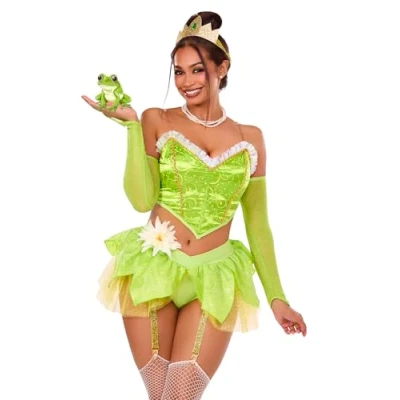 Green satin corset top with gold accents Sheer glitter off-shoulder sleeves Layered petal skirt with golden tulle Includes golden crown headband STYLE INSPO: Complete your adult princess costume with sexy thigh high stockings for a royally hot look! Feeling a little more magical? Swap the crown and pin-on flower for adult fairy wings to create your own DIY sexy fairy costume for women, Manufacturer: Leg Avenue