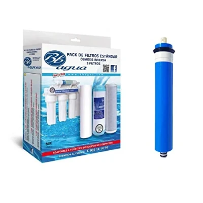 Membrane of 50 gpd has a production of up to 190 liters of water day. bbagua. Ideal for your Reverse Osmosis equipment. 1 Cartridge 10" of Sediments 5 microns, for the removal of solids in suspension, soil, mud and sand of a size greater than 5 microns. Protects and increases the membrane life of your Reverse Osmosis equipment. 1 x 10" GAC Carbon Cartridge Removes chlorine, heavy materials, dioxins, pesticides and odors by adsorption. Protects and increases the membrane life of your Reverse Osmosis equipment. 1 x 10" Carbon Block Cartridge It has just removed chlorine, heavy metals, dioxins and odors by adsorption, protecting the membrane from small particles. Protects and increases the membrane life of your Reverse Osmosis equipment. Bbagua is a registered trademark of the Pollet Water Goup Group. Specializing in domestic water treatment., Weight: 0.110231131 pounds, Manufacturer: Pollet Water Group