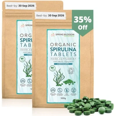 [CURRENT BATCH BEST-BEFORE DATE: SEP’2026] PURE & CERTIFIED ORGANIC – Grown organically in freshwater cultivation ponds, Spring Blossom spirulina tablets contain the purest form of the micro-algae plant. Once harvested, only the finest plants are selected, dried, milled to powder and finally compressed into easy-to-swallow tablets. No binders, fillers, conservatives or any other nasties are added. The tablets are packed at source, in eco-friendly, fully-recyclable and resealable kraft pouches to help maintain the freshness of the tablets NUTRITIONAL POWERHOUSE – Considered to be one of the oldest and most nutrient dense foods on Earth, spirulina is exceptionally high in antioxidants, vitamins A & B12, and an excellent source of protein, iron, calcium, phycocyanin and chlorophyll. Regular consumption of spirulina tablets has been known to help strengthen the immune system, aid cardiovascular health and support a healthy lifestyle. Used as part of a varied diet, it can help to regulate blood pressure and lower cholesterol. 6 MONTH SUPPLY – Expect premium quality and great value with our 500-gram pack, consisting of 1,000 x 500mg tablets; enough to last you for approximately six months. Compared with powder, our easy-to-swallow tablets make it very super easy to incorporate into your daily routine or diet. Described as nature’s multivitamin, spirulina increases your well-being, speeds up weight loss and promotes a healthy digestive system. Try spirulina today and let the nutrition seep into every cell of your body! FOR THE BODY & MIND – Try spirulina today and feel the difference after only 1 month of regular consumption. You will feel more energised, hydrated and healthier as a whole. Spirulina has proven anti-inflammatory and self-healing properties and is known to effectively detoxify the body by helping it to naturally release toxins. Aside from the physical benefits of spirulina, it can also be highly beneficial for your mental health as it contains tryptophan, which is essential in creating serotonin 100% VEGETARIAN & VEGAN FRIENDLY – More of a miracle than a food supplement, spirulina contains a perfect balance of protein (including essential amino acids), it is easily digested and assimilated, and quickly satisfies hunger. It is naturally low in calories, fat and sodium. Spirulina adds an incredible boost of protein to your diet as a supplement to various foods, and for people with gluten or soy intolerance, it is an excellent alternative to the usual suspects.