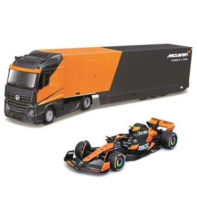 MERCEDES SEMI TRUCK WITH MCLAREN MCL38 (2024) #4 NORRIS: Official 1:43 scale set including the Mercedes Semi Truck and Lando Norris' McLaren MCL38 #4 single-seater, with realistic liveries. FEATURES: High-quality diecast models made with extreme attention to detail, perfect for collectors and fans of Formula 1 and the McLaren team. RECOMMENDED AGE: Scale model cars and trucks suitable for children aged 36 months and up, also ideal for adult collectors and fans of McLaren and Lando Norris. IDEAL AS A GIFT: Want to give an original gift to a Formula 1 fan? The Mercedes set with McLaren MCL38 is the perfect choice for any fan of the British team. BBURAGO: The iconic brand of die-cast scale model vehicles licensed by major car manufacturers. Its models have contributed to the growth of children around the world, as well as the passion of adults and avid vehicle collectors., Manufacturer: MAY CHEONG GROUP