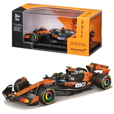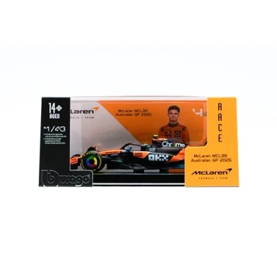 MCLAREN F1 MCL39 2025: Official 1:43 scale replica of the single-seater driven by Lando Norris for the McLaren team in the 2025 season, complete with helmet, featuring papaya and anthracite black livery and details faithful to the original design. FEATURES: Die-cast metal model made by Bburago with great attention to technical detail. Complete with a customised base and transparent display case, it is perfect for any F1 collection. RECOMMENDED AGE: Scale model cars, perfect for collectors aged 14 and over. IDEAL AS A GIFT: Want to surprise a Lando Norris or McLaren fan? This 1:43 scale F1 model car is the ideal gift to enrich any motor racing enthusiast's collection. BBURAGO: The iconic brand of die-cast scale model vehicles licensed by major car manufacturers. Its models have contributed to the growth of children around the world, the passion of adults and great vehicle collectors., Manufacturer: MAY CHEONG GROUP